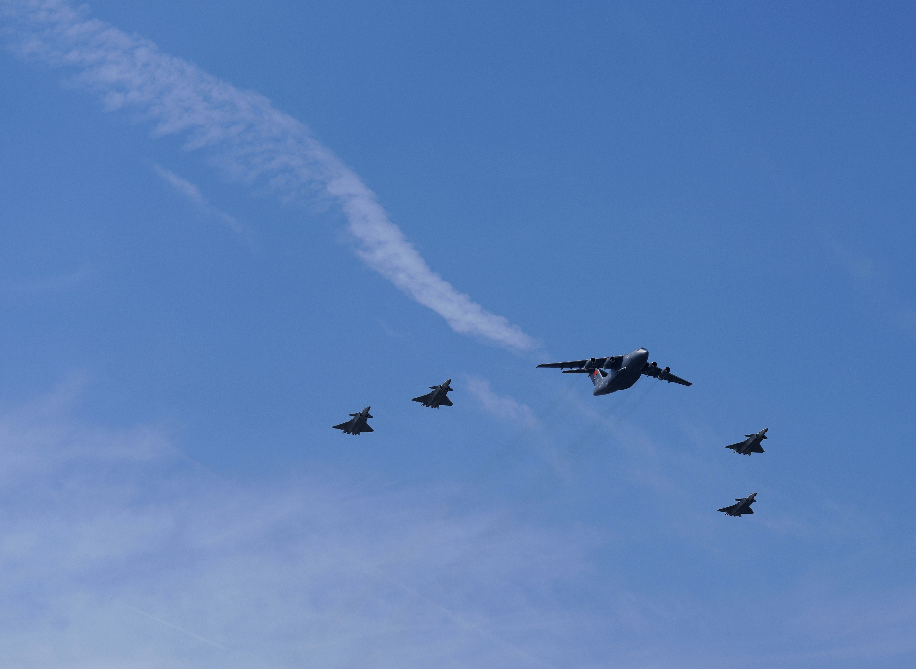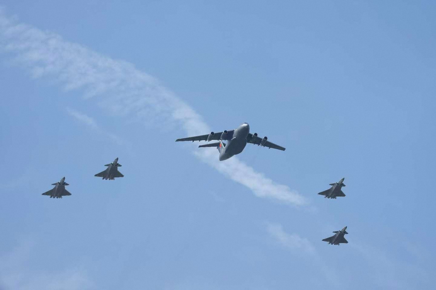 9月12日,第十二批在韩中国人民志愿军烈士遗骸回国。这是为接运烈士遗骸回国的运-20专机伴飞护航的歼-20飞机。新华社发(肖航 摄)