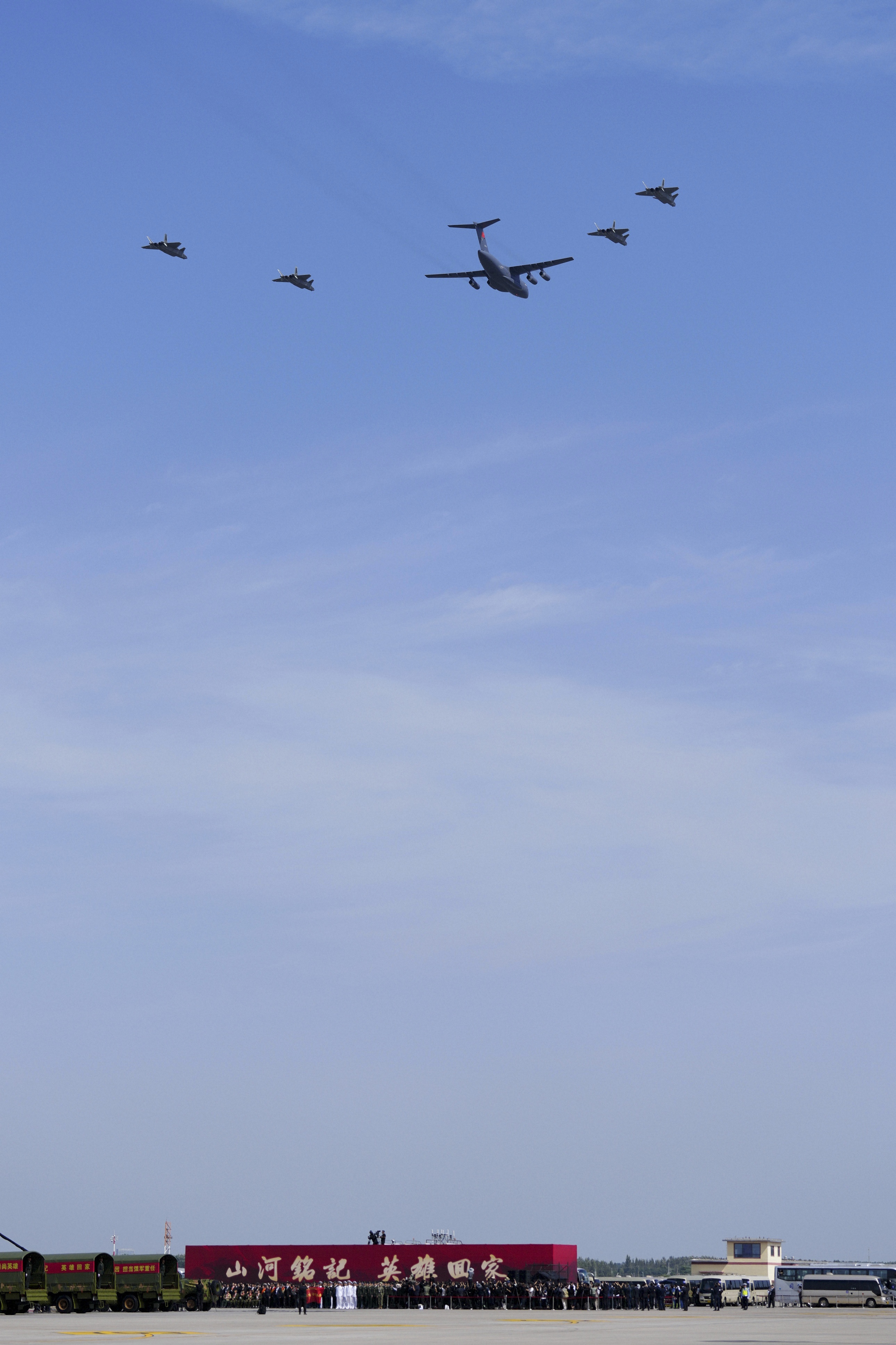 9月12日,第十二批在韩中国人民志愿军烈士遗骸回国。这是在沈阳桃仙国际机场,接运烈士遗骸回国的运-20专机在4架歼-20飞机伴飞护航下即将降落。新华社发(杨盼 摄)