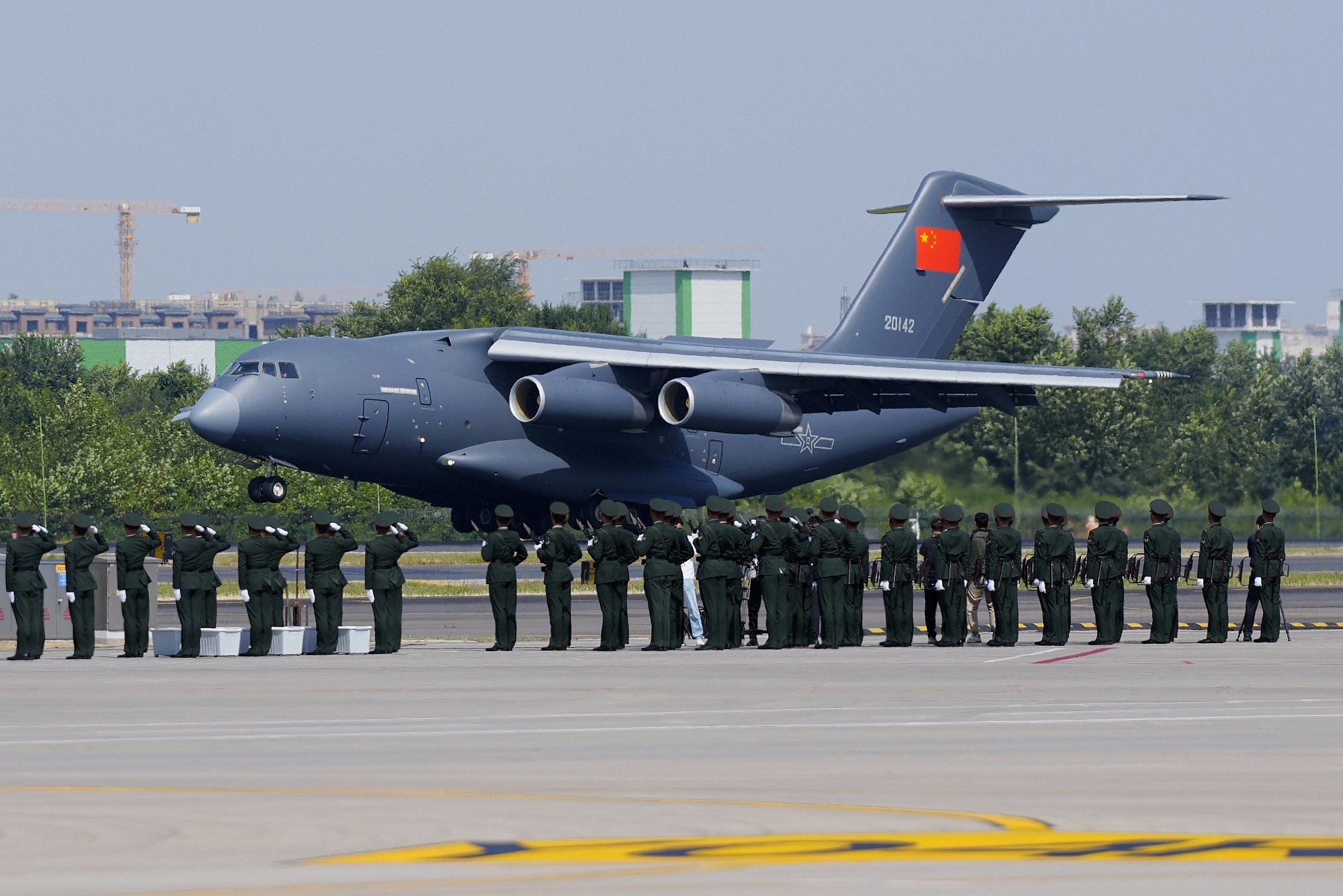 9月12日,第十二批在韩中国人民志愿军烈士遗骸回国。这是接运烈士遗骸回国的运-20飞机降落在沈阳桃仙国际机场。新华社发(杨盼 摄)