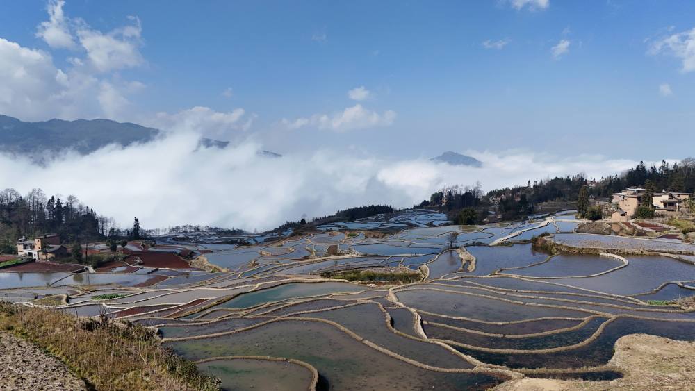 ?在云南红河州元阳哈尼梯田,层层梯田宛如明镜,当地人遵循“冬春注水养田”传统,通过层级沟渠为梯田蓄满山泉水。