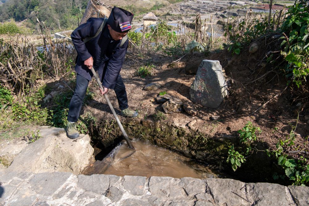 2026年1月31日,云南省红河哈尼族彝族自治州元阳县新街镇村民在清理水渠。新华社发(甘与汇 摄)