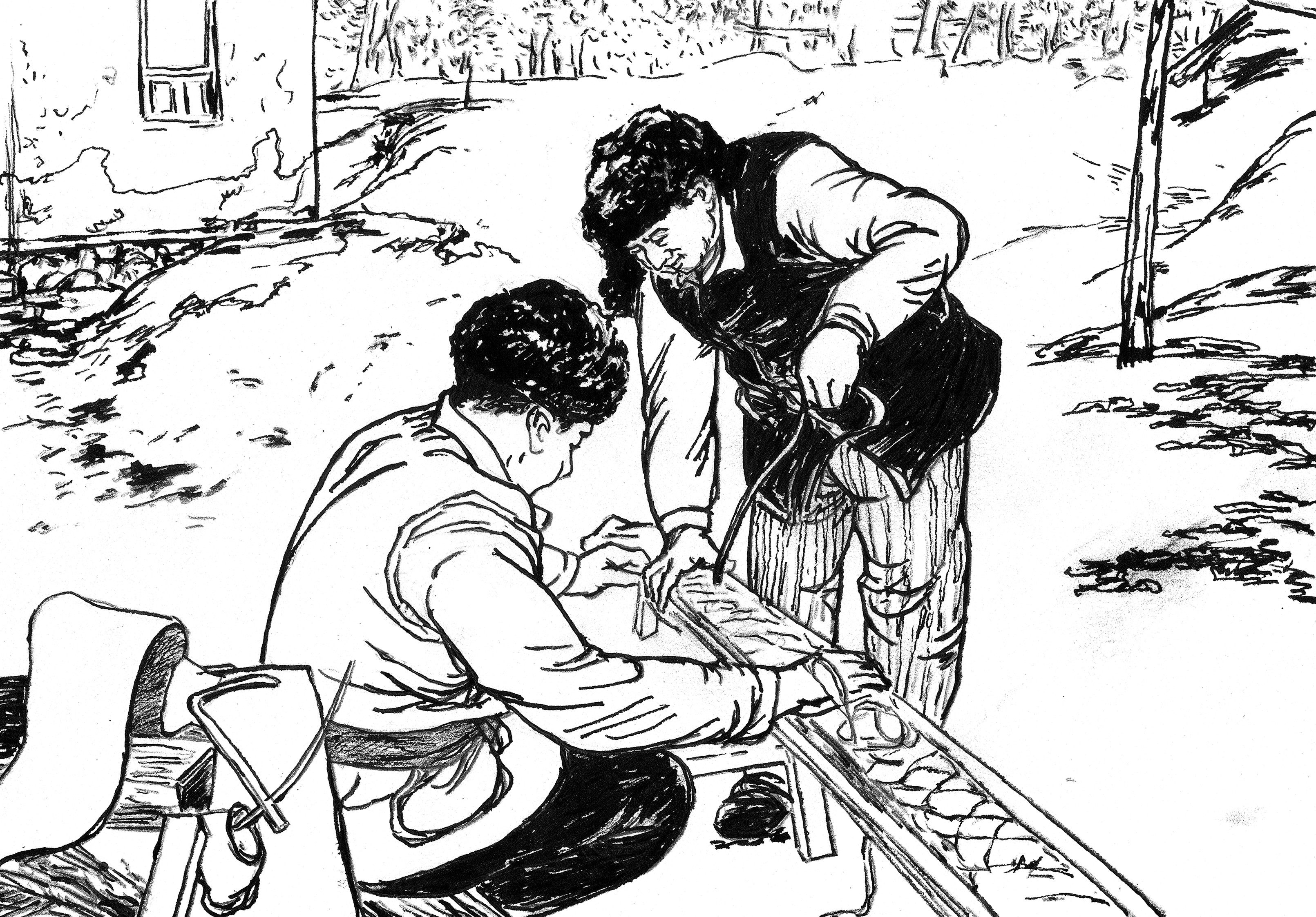 9 抛光木板后,蒸煮板头,将其弯折成150度的钝角。木板中部打眼穿皮绳以便于固定前脚掌,将熟好的马皮附在木板上进行晾晒,毛皮在收缩过程中紧紧包裹木板,从而实现不脱落。