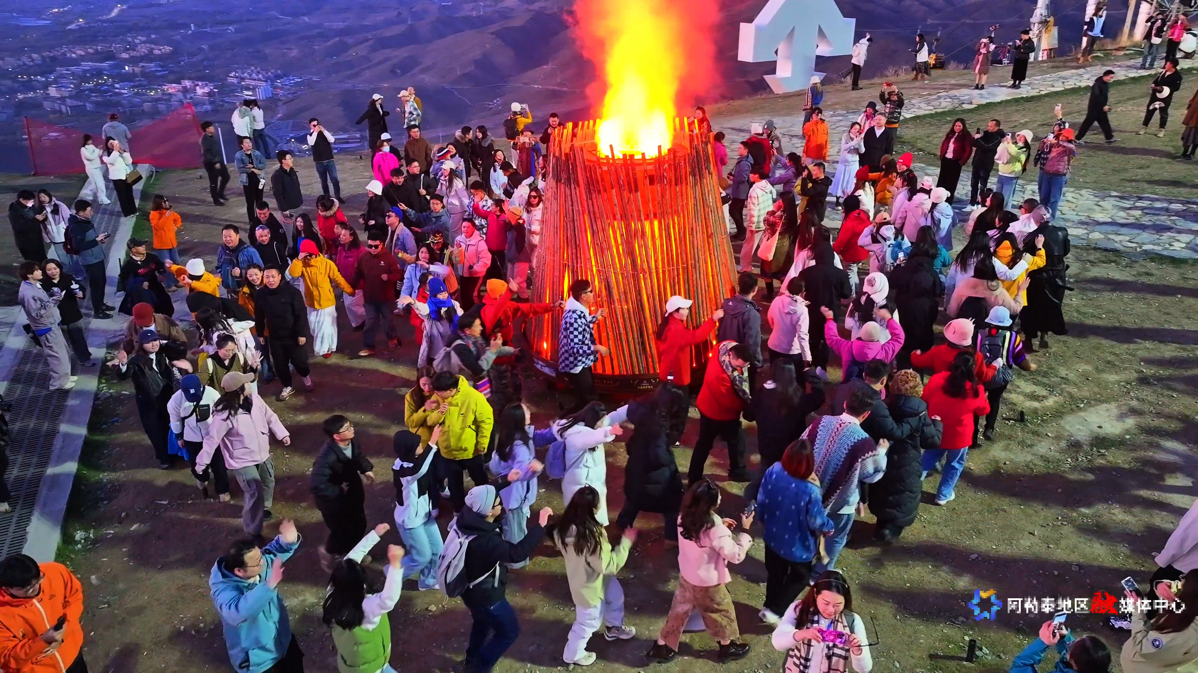 10月8日傍晚,虽已是国庆中秋假期最后一天,但仍有500余名游客陆续乘坐缆车来到将军山顶,和天空、夕阳、雪山、篝火一起,踏着音乐节拍欢快起舞。