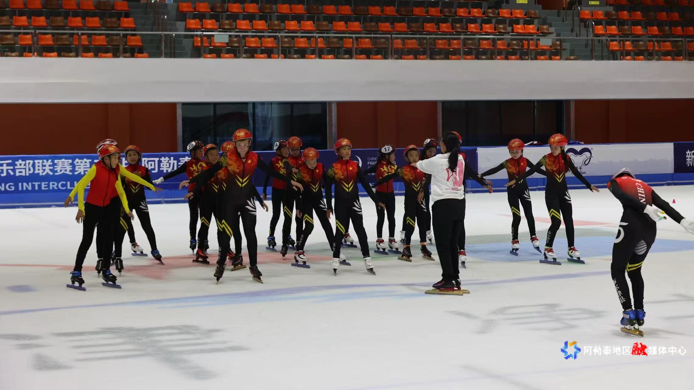 雪假期间,学生在布尔津县冰上运动中心练习滑冰。布尔津县文化体育广播电视和旅游局供图