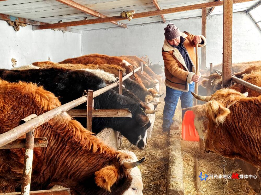 月17日,富蕴县吐尔洪乡托留拜克孜勒村村民阿勒斯别克·谢尔亚孜正在暖圈里给牛羊喂饲草料。记者 张福新摄