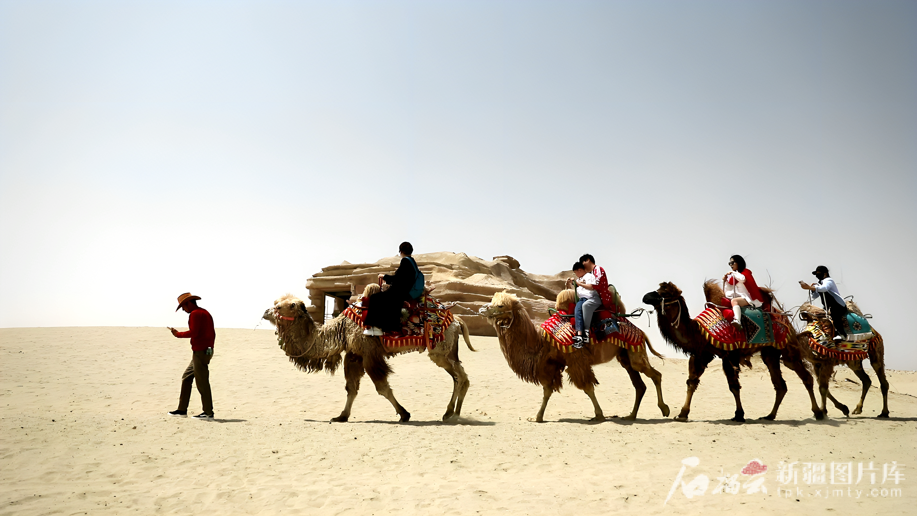游客在塔克拉玛干·三五九旅文化旅游区沙漠之门景区体验骆驼骑行。林国强 摄