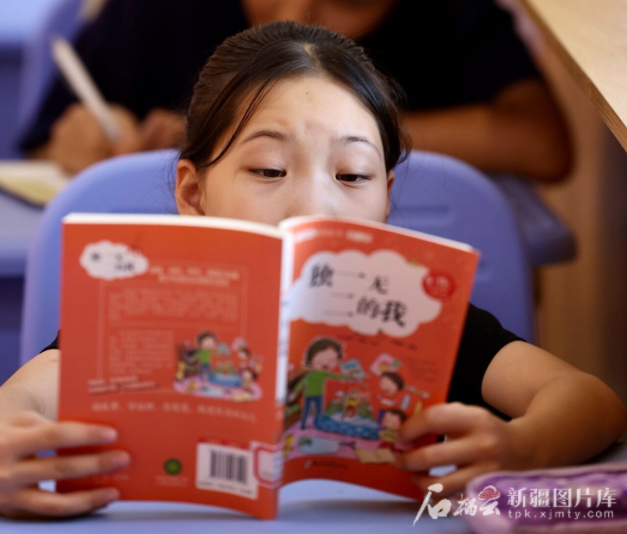 8月11日,在昌吉市刺桐国学书院,孩子们在泉昌情阅读文化长廊阅读学习。