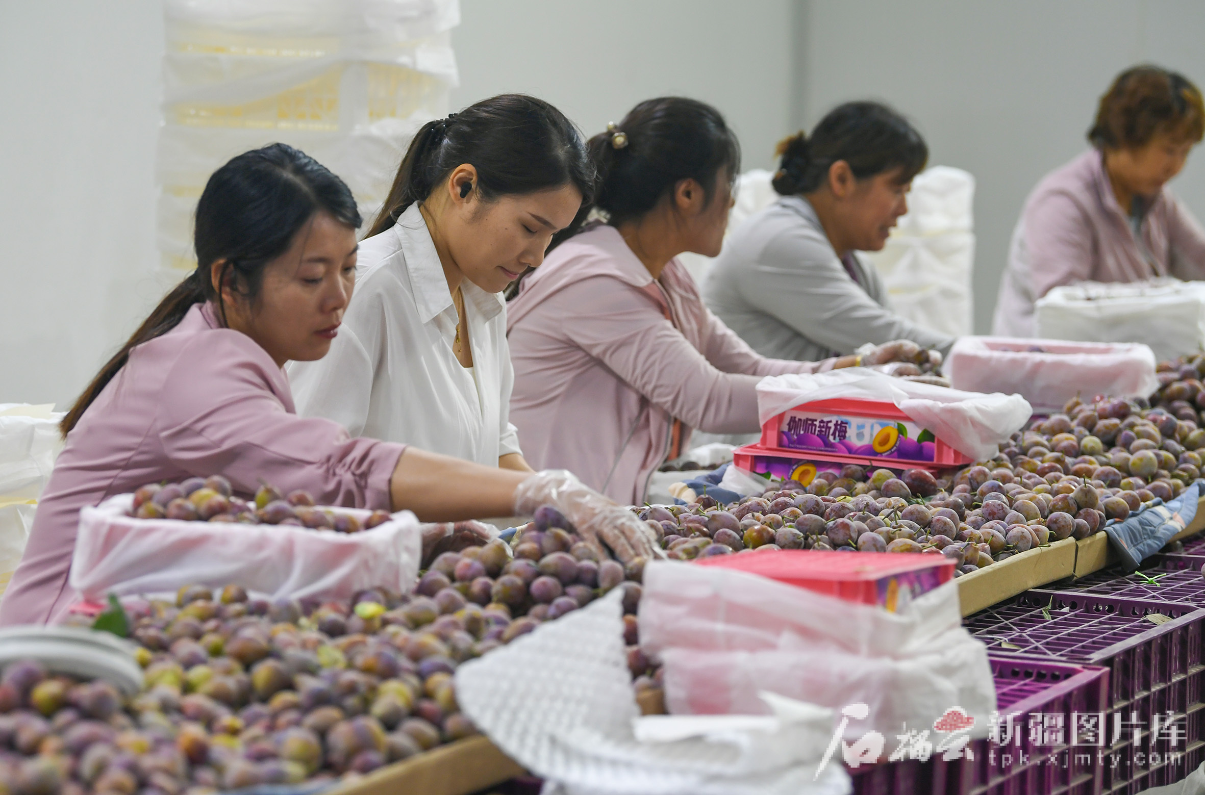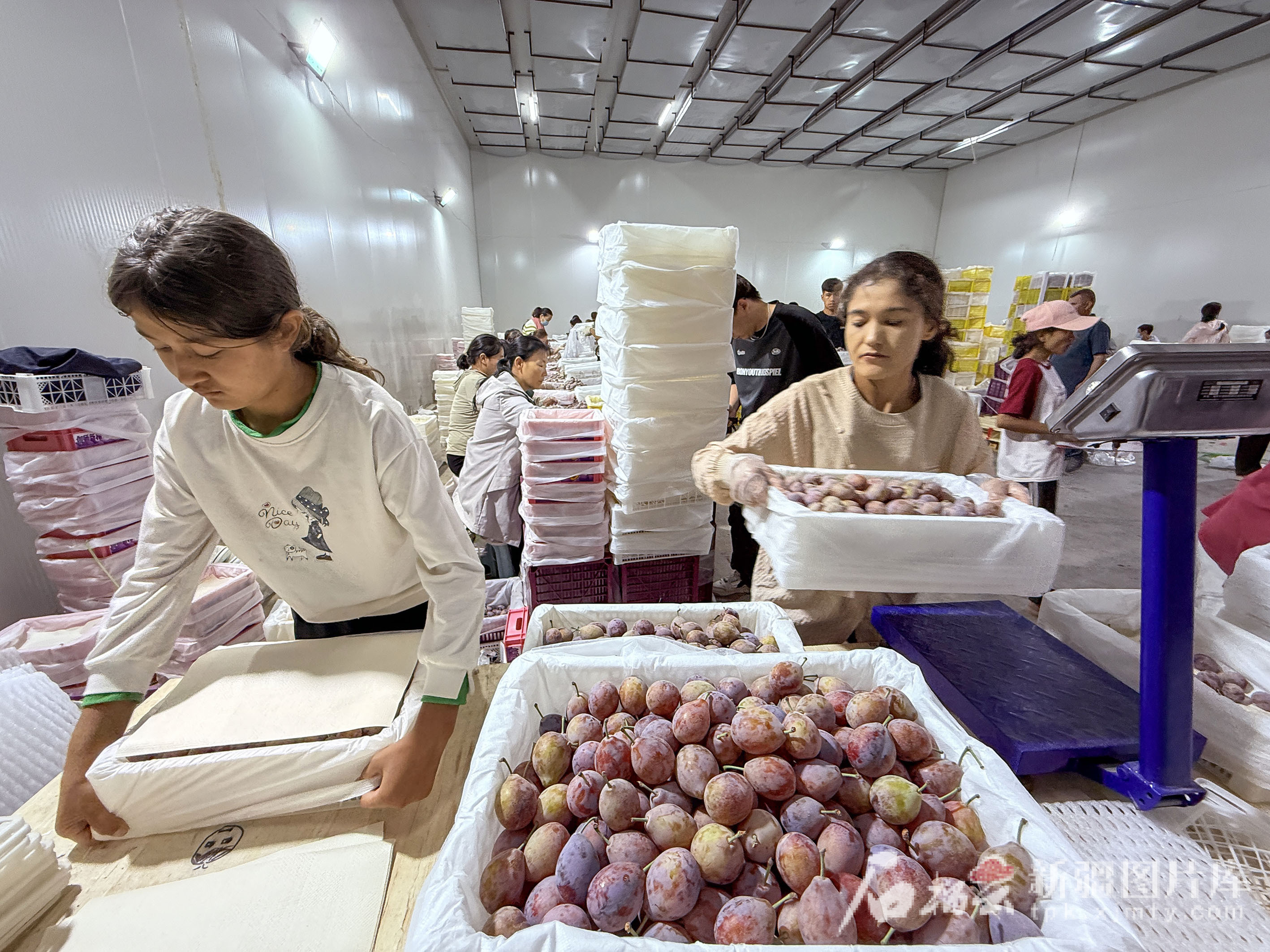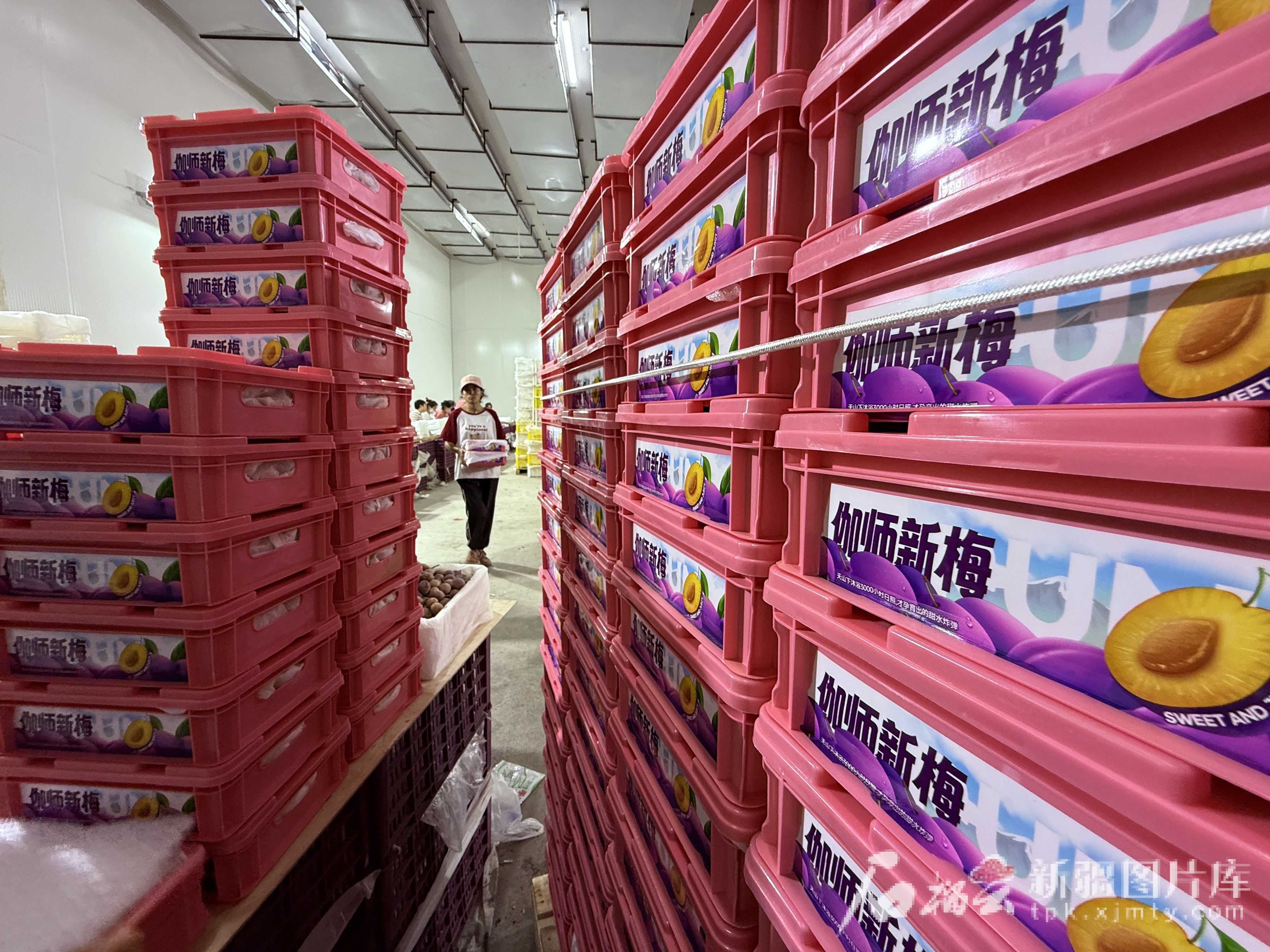 8月12日,伽师县粤伽新梅现代产业园工人在冷链仓储物流分选区将新梅装箱。