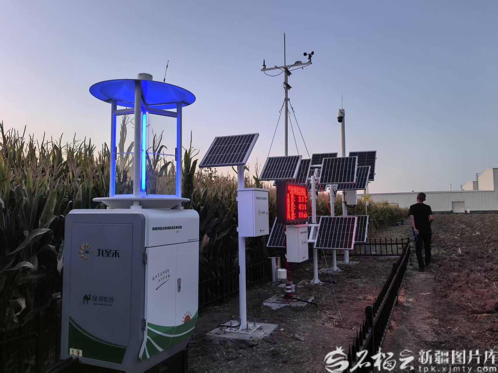 九圣禾种业股份有限公司试验田边,一排头顶蓝色光伏板的农业智能监测设备格外醒目。石榴云/新疆日报记者 于江艳摄