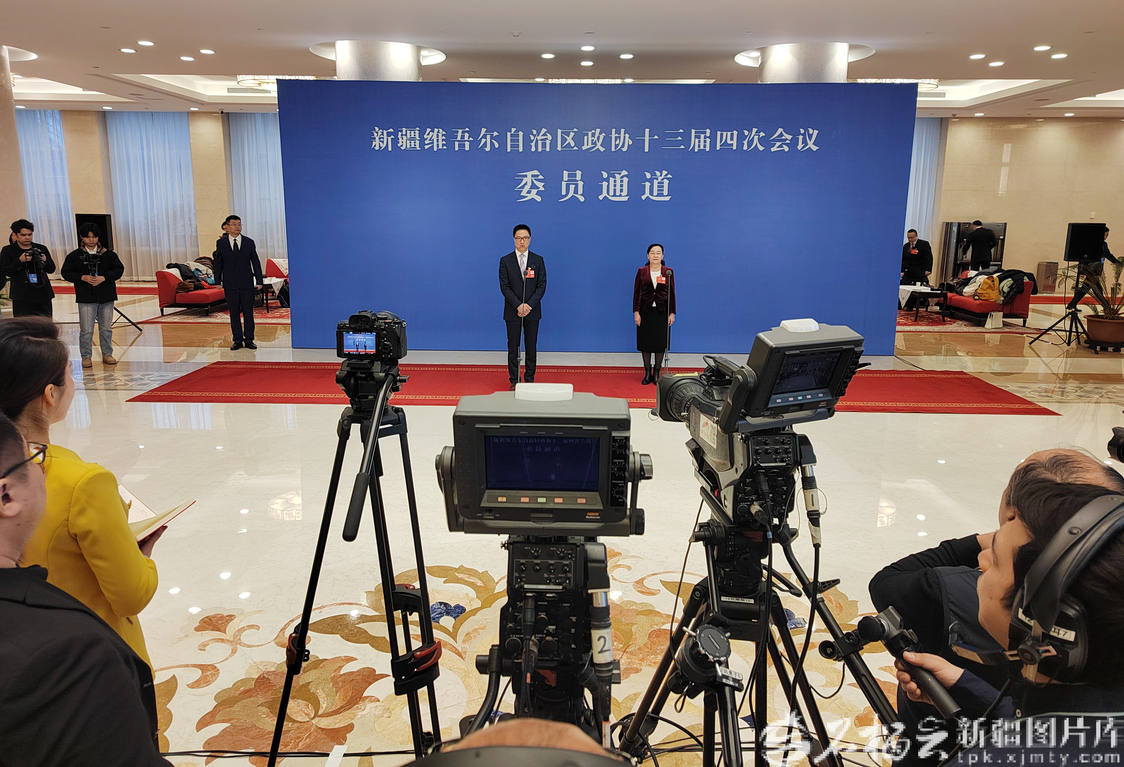 1月26日,自治区政协十三届四次会议“委员通道”集体采访活动现场,王西华、阿米娜·乌拉孜哈力两位委员接受媒体记者采访。石榴云/新疆日报记者 邹懿摄