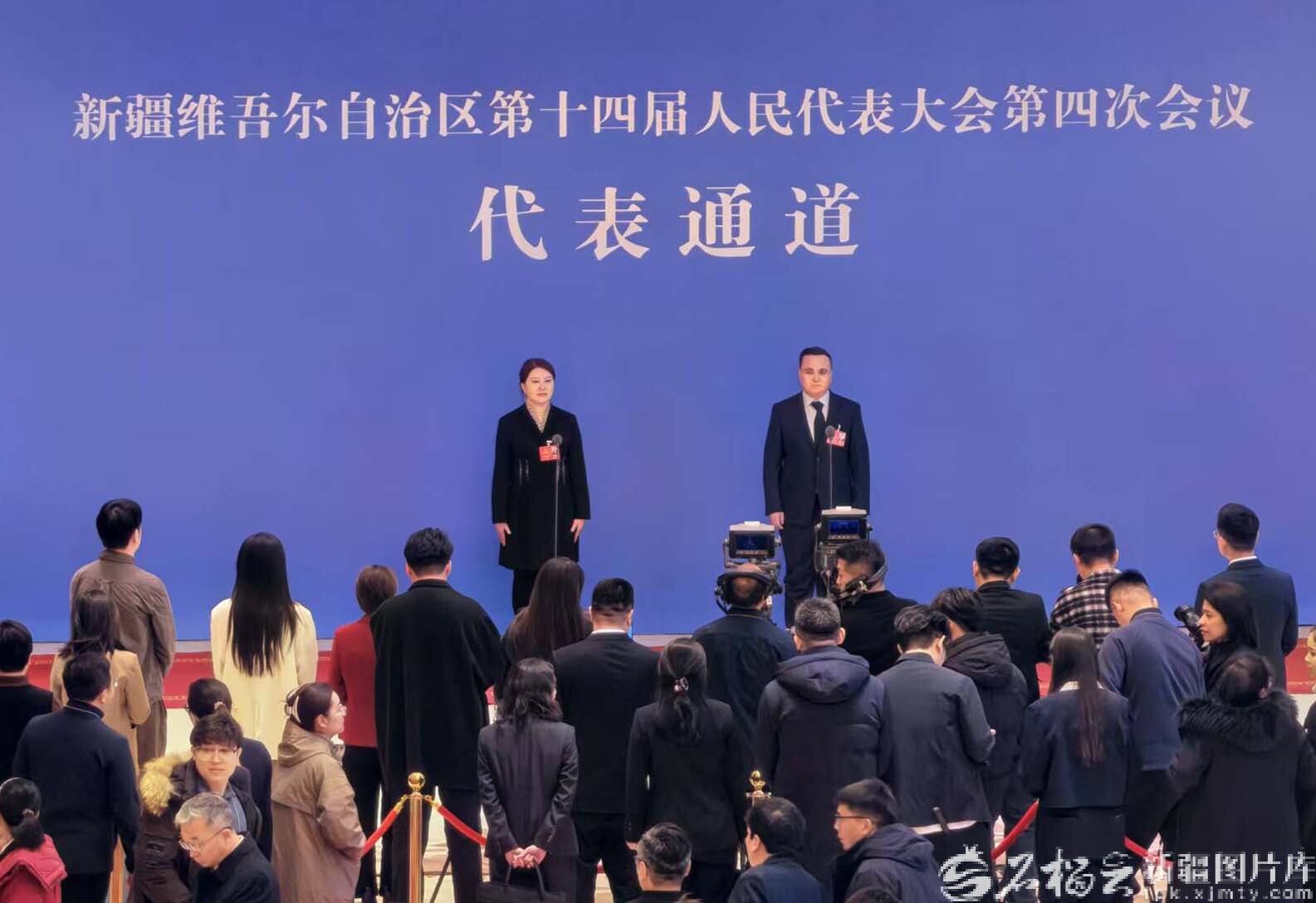 1月27日上午,自治区十四届人大四次会议“代表通道”集体采访活动现场,阿拉法特·艾海提、马新艳两位代表接受采访。天山网-新疆日报记者 蔡增乐摄